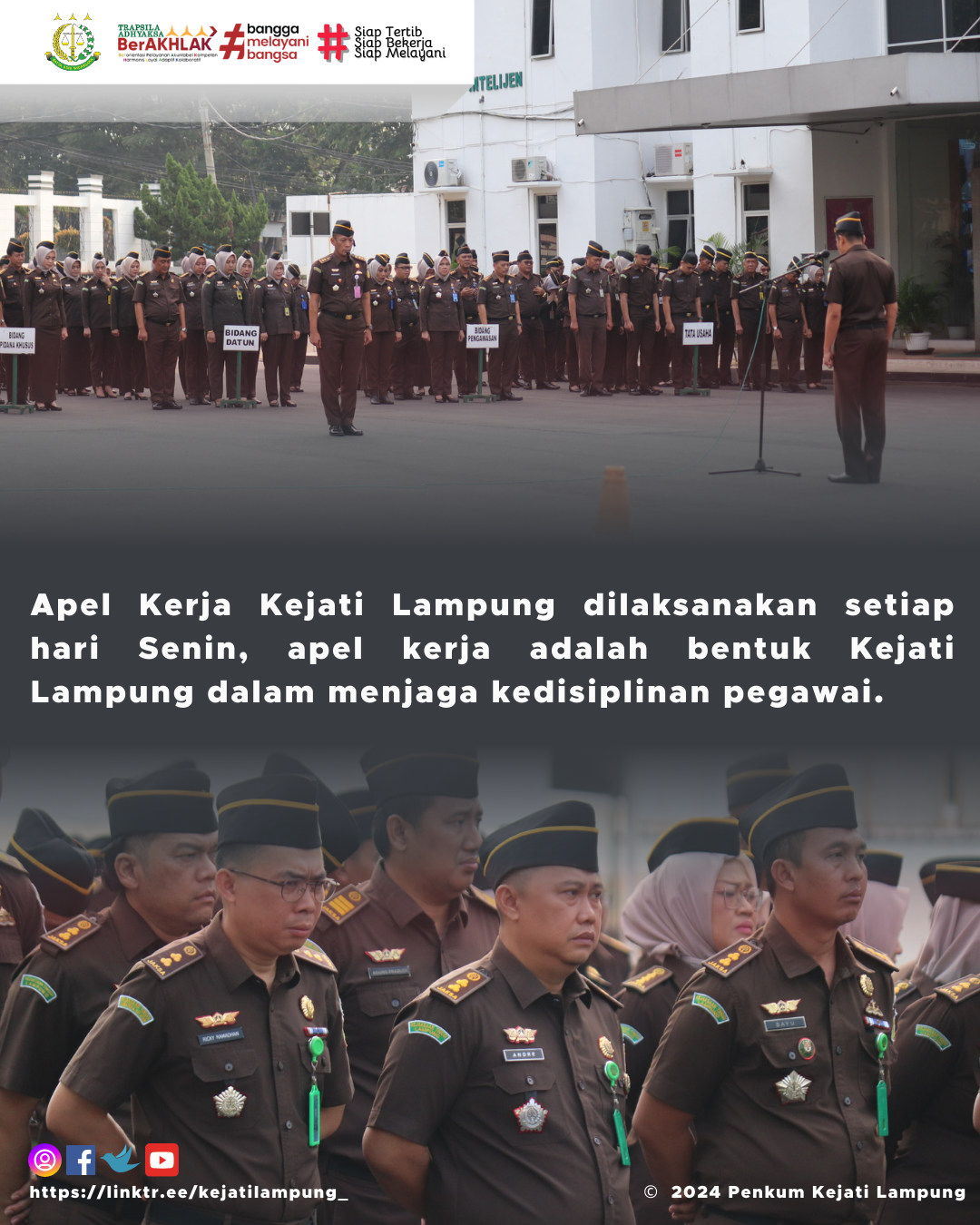 Apel Kerja Kejati Lampung dilaksanakan setiap hari Senin, apel kerja adalah bentuk Kejati Lampung dalam menjaga kedisiplinan pegawai.