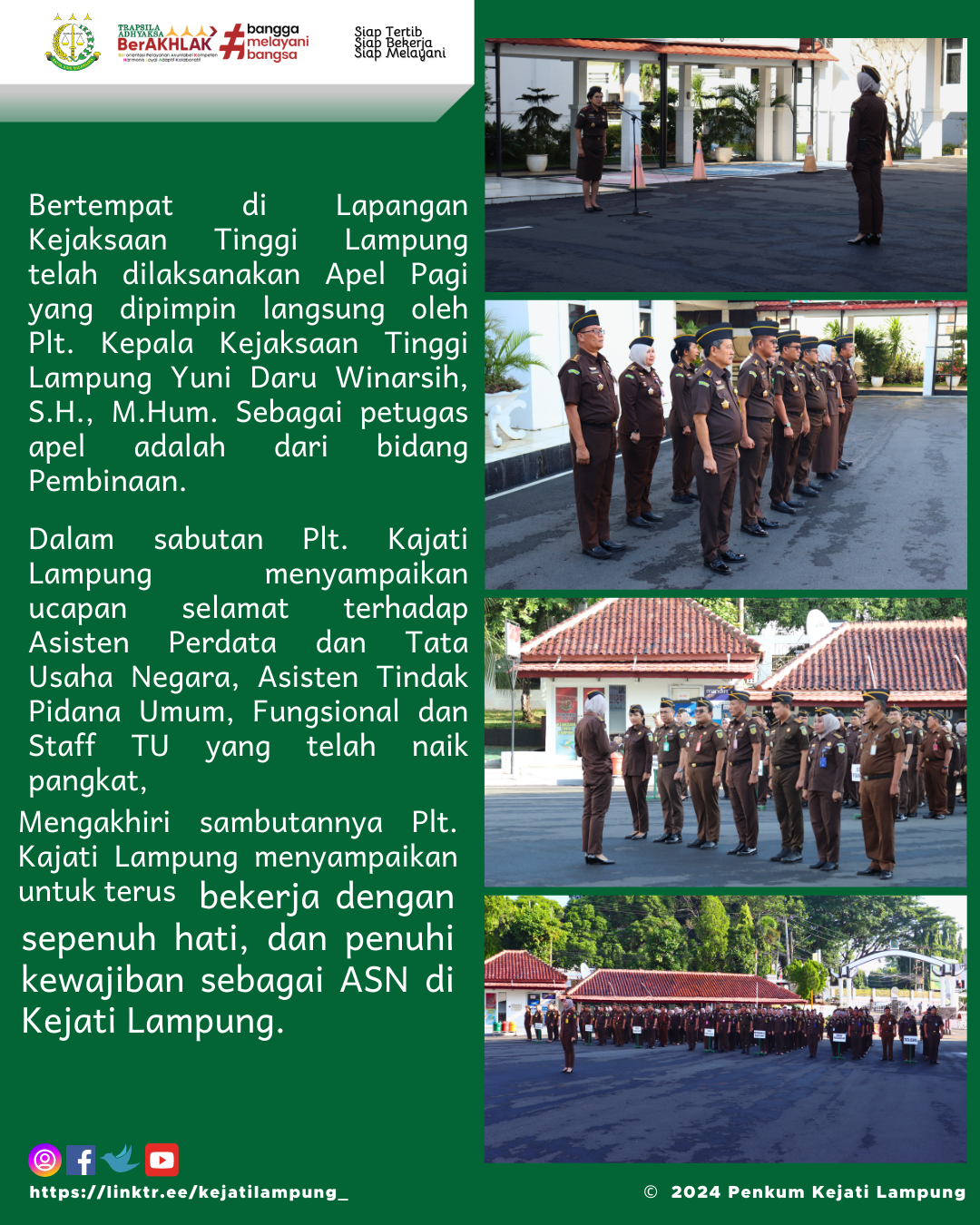 Mengakhiri sambutannya Plt. Kajati Lampung menyampaikan untuk terus bekerja dengan sepenuh hati, dan penuhi kewajiban sebagai ASN di Kejati Lampung.