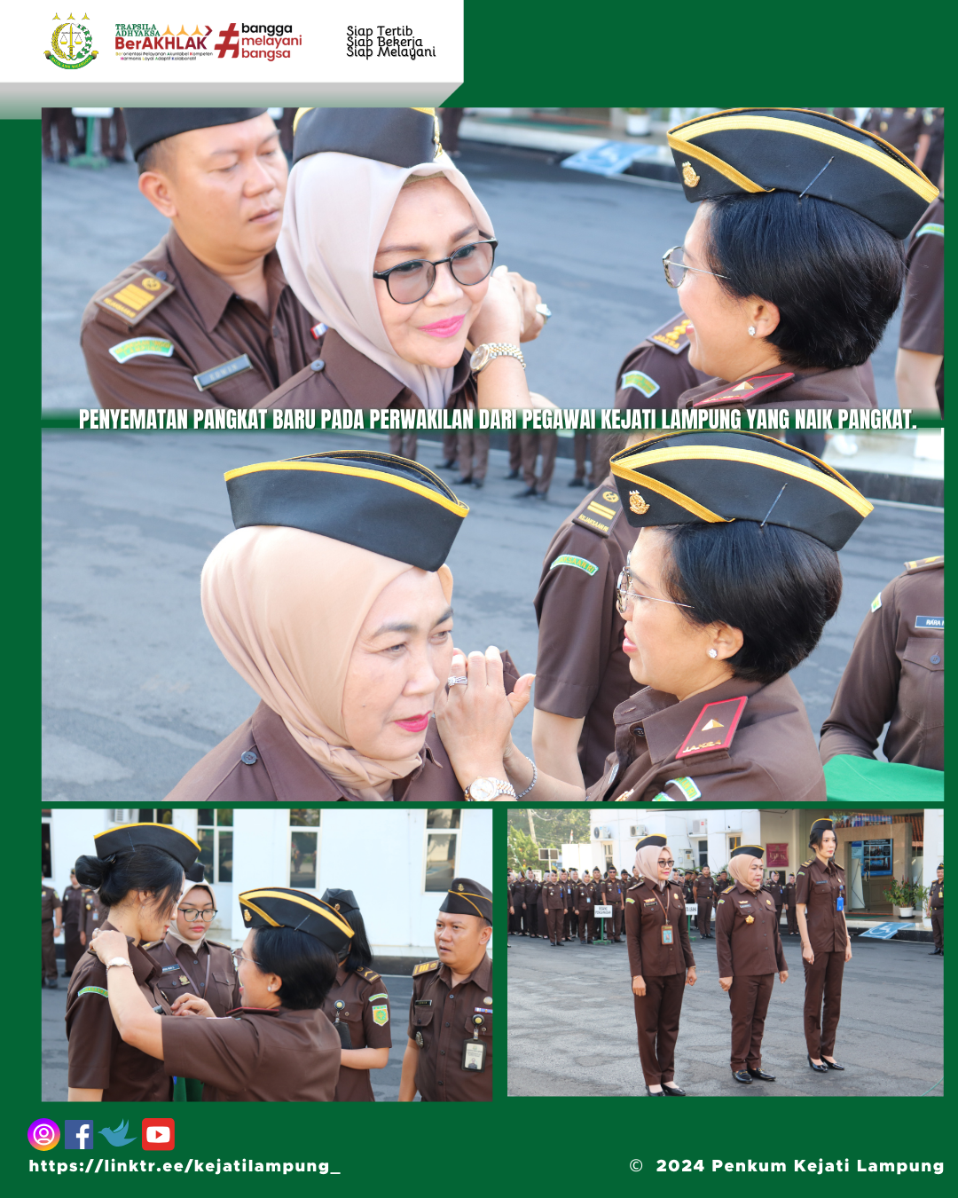 Pada Hari Senin tanggal 22 April 2024 Pukul 07.30 WIB , bertempat di Lapangan Kejaksaan Tinggi Lampung telah dilaksanakan Apel Pagi yang dipimpin langsung oleh Plt. Kepala Kejaksaan Tinggi Lampung Yuni Daru Winarsih, S.H., M.Hum. Sebagai petugas apel adalah dari bidang Pembinaan. Ditengah pelaksanaan apel, Plt Kajati Lampung menyematkan pangkat baru pada perwakilan dari Pegawai Kejati Lampung yang naik pangkat.
