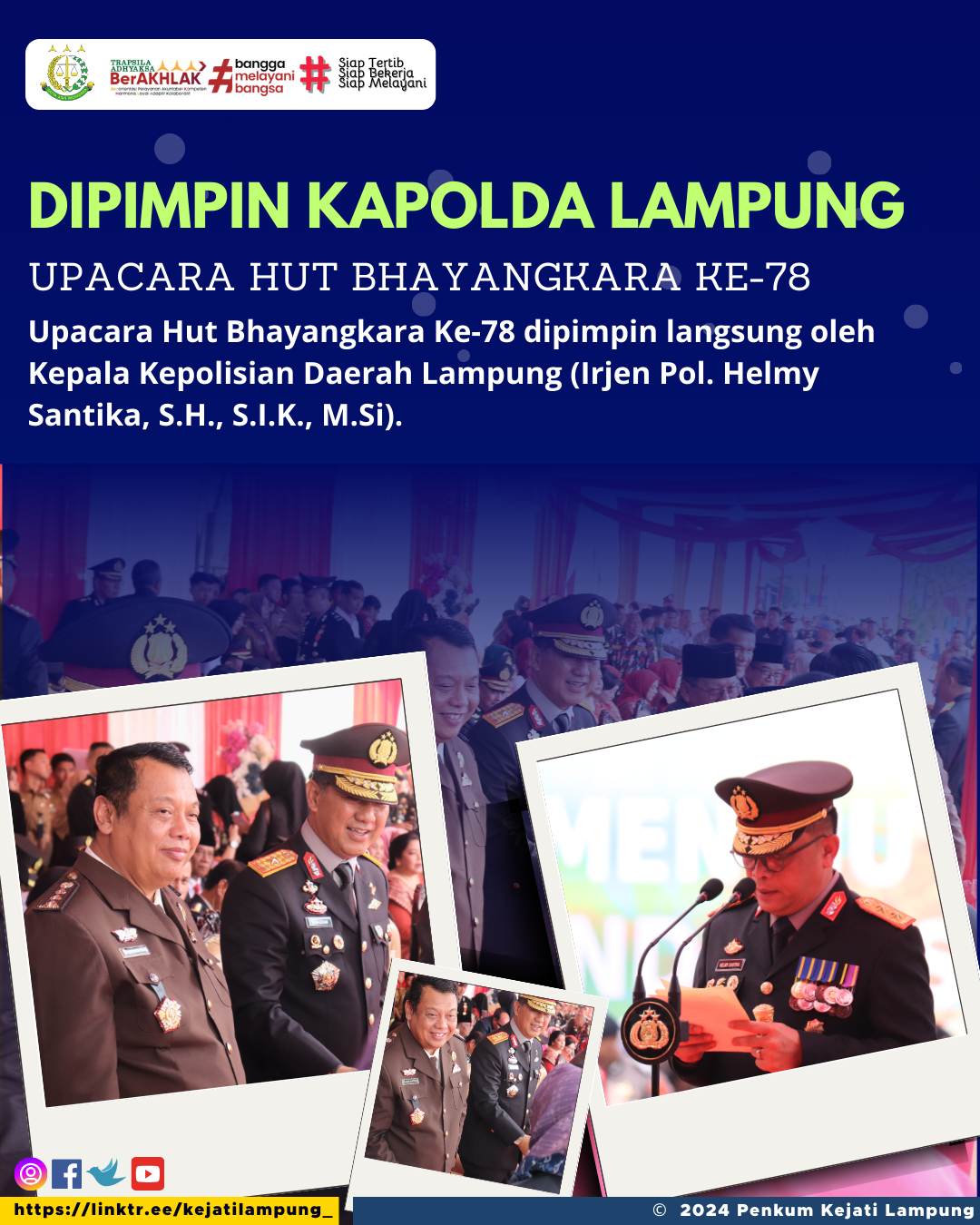 Upacara Hut Bhayangkara Ke-78 dipimpin langsung oleh Kepala Kepolisian Daerah Lampung (Irjen Pol. Helmy Santika, S.H., S.I.K., M.Si).