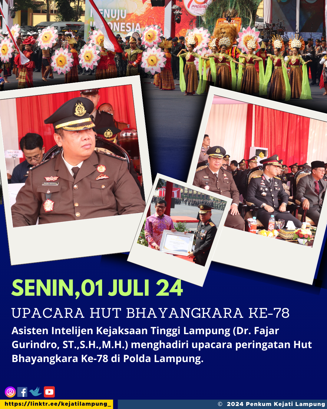 Senin,01 Juli 2024, Asisten Intelijen Kejaksaan Tinggi Lampung (Dr. Fajar Gurindro, ST.,S.H.,M.H.) menghadiri upacara peringatan Hut Bhayangkara Ke-78 di Polda Lampung.