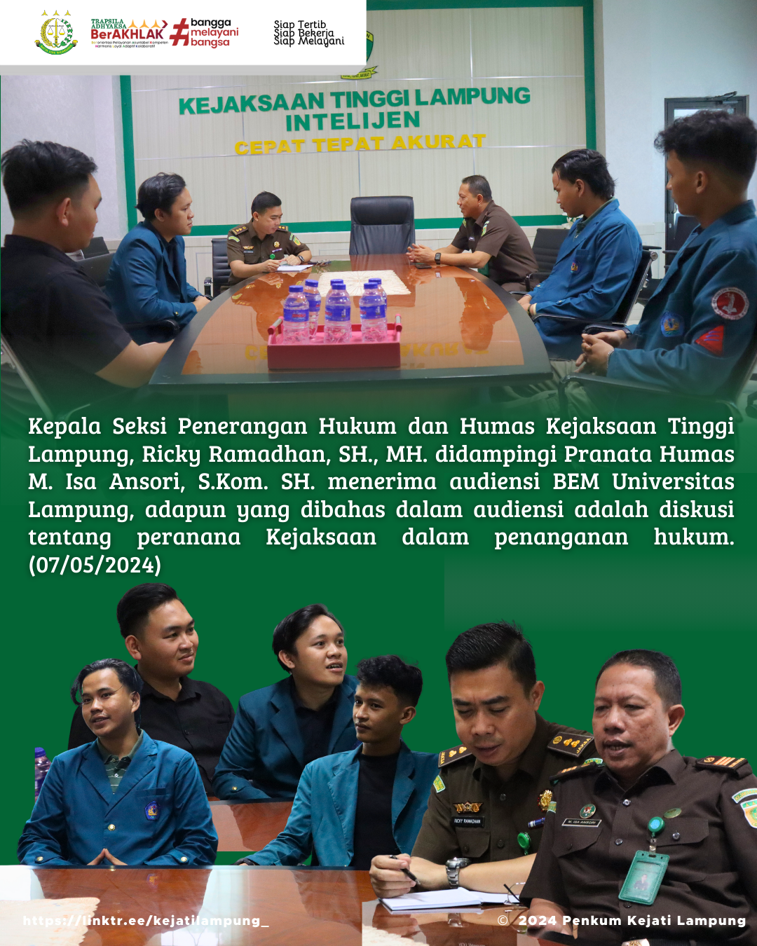 Kepala Seksi Penerangan Hukum dan Humas Kejaksaan Tinggi Lampung, Ricky Ramadhan, SH., MH. didampingi Pranata Humas M. Isa Ansori, S.Kom. SH. menerima audiensi BEM Universitas Lampung, adapun yang dibahas dalam audiensi adalah diskusi tentang peranana Kejaksaan dalam penanganan hukum. (07/05/2024)