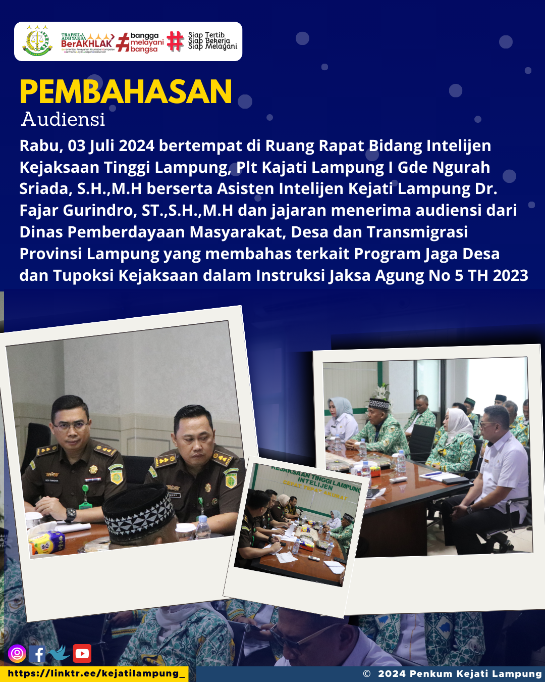 Rabu, 03 Juli 2024 bertempat di Ruang Rapat Bidang Intelijen Kejaksaan Tinggi Lampung, Plt Kajati Lampung I Gde Ngurah Sriada, S.H.,M.H berserta Asisten Intelijen Kejati Lampung Dr. Fajar Gurindro, ST.,S.H.,M.H dan jajaran menerima audiensi dari Dinas Pemberdayaan Masyarakat, Desa dan Transmigrasi Provinsi Lampung yang membahas terkait Program Jaga Desa dan Tupoksi Kejaksaan dalam Instruksi Jaksa Agung No 5 TH 2023