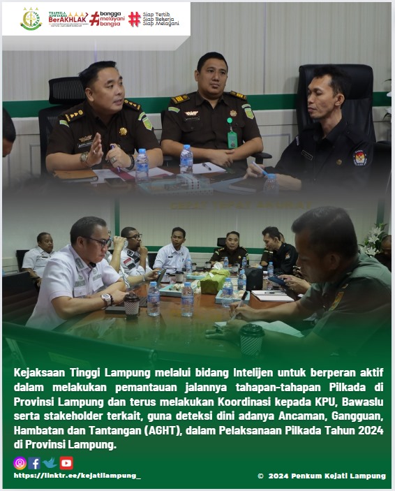 Kejaksaan Tinggi Lampung melalui bidang Intelijen untuk berperan aktif dalam melakukan pemantauan jalannya tahapan-tahapan Pilkada di Provinsi Lampung dan terus melakukan Koordinasi kepada KPU, Bawaslu serta stakeholder terkait, guna deteksi dini adanya Ancaman, Gangguan, Hambatan dan Tantangan (AGHT), dalam Pelaksanaan Pilkada Tahun 2024 di Provinsi Lampung.