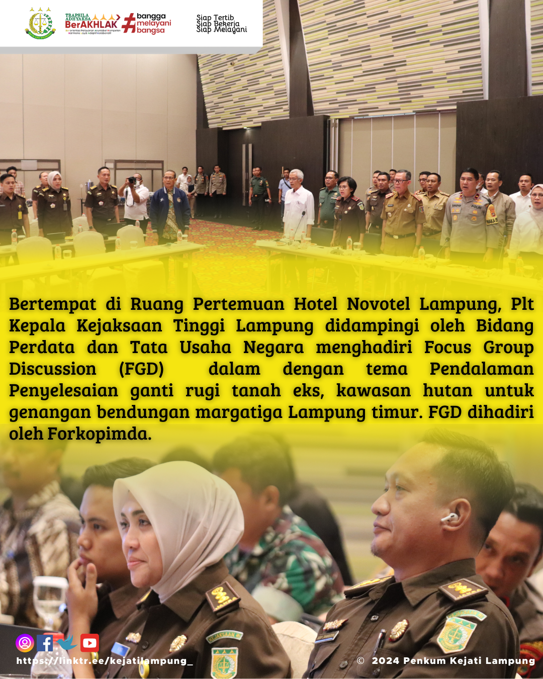 Bertempat di Ruang Pertemuan Hotel Novotel Lampung, Plt Kepala Kejaksaan Tinggi Lampung didampingi oleh Bidang Perdata dan Tata Usaha Negara menghadiri Focus Group Discussion (FGD) dalam dengan tema Pendalaman Penyelesaian ganti rugi tanah eks, kawasan hutan untuk genangan bendungan margatiga Lampung timur. FGD dihadiri oleh Forkopimda.