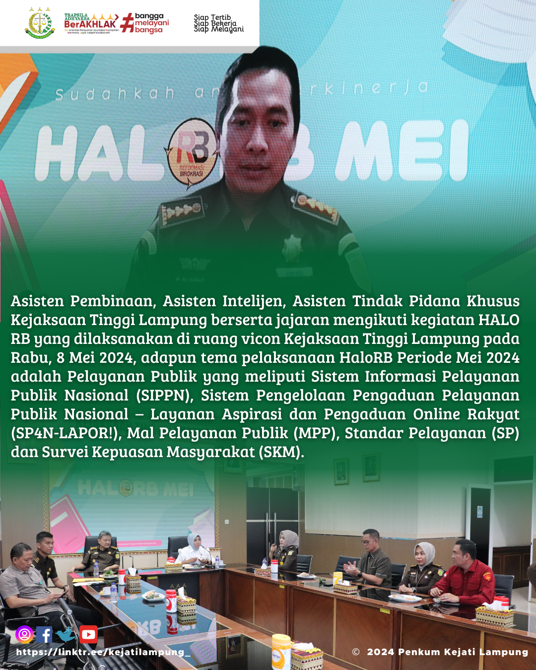 Asisten Pembinaan, Asisten Intelijen, Asisten Tindak Pidana Khusus Kejaksaan Tinggi Lampung berserta jajaran mengikuti kegiatan HALO RB yang dilaksanakan di ruang vicon Kejaksaan Tinggi Lampung pada Rabu, 8 Mei 2024, adapun tema pelaksanaan HaloRB Periode Mei 2024 adalah Pelayanan Publik yang meliputi Sistem Informasi Pelayanan Publik Nasional (SIPPN), Sistem Pengelolaan Pengaduan Pelayanan Publik Nasional – Layanan Aspirasi dan Pengaduan Online Rakyat (SP4N-LAPOR!), Mal Pelayanan Publik (MPP), Standar Pelayanan (SP) dan Survei Kepuasan Masyarakat (SKM).