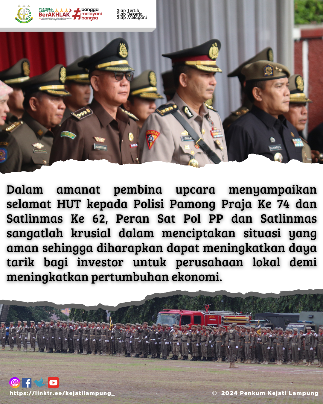 Dalam amanat pembina upacara menyampaikan selamat HUT kepada Polisi Pamong Praja Ke 74 dan Satlinmas Ke 62, Peran SatPol PP dan Satlinmas sangatlah krusial dalam menciptakan situasi yang aman sehingga diharapkan dapat meningkatkan daya tarik bagi investor untuk perusahaan lokal demi meningkatkan pertumbuhan ekonomi.