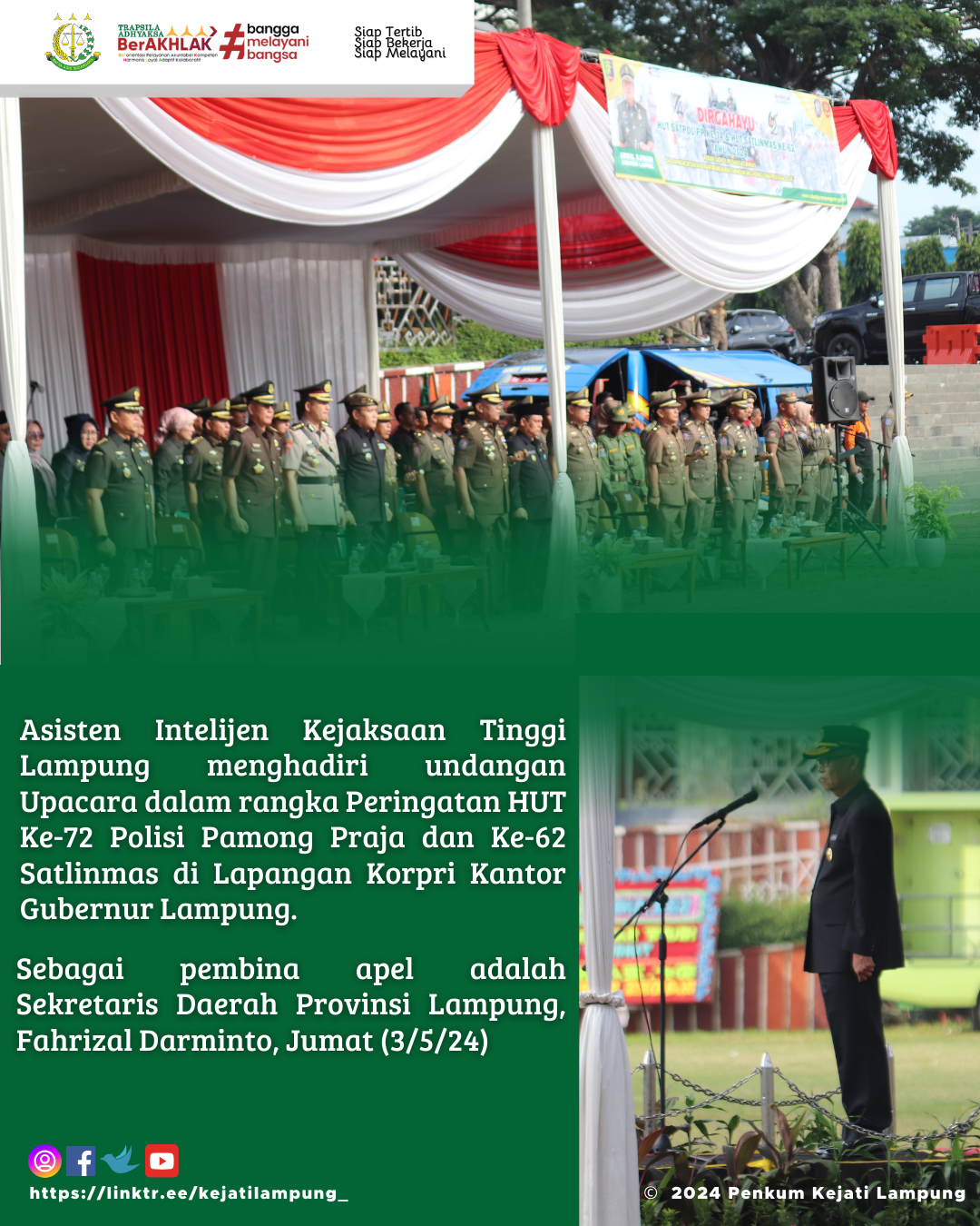 Asisten Intelijen Kejaksaan Tinggi Lampung menghadiri undangan Upacara dalam rangka Peringatan HUT Ke-72 Polisi Pamong Praja dan Ke-62 Satlinmas di Lapangan Korpri Kantor Gubernur Lampung. Sebagai pembina apel adalah Sekretaris Daerah Provinsi Lampung, Fahrizal Darminto, Jumat (3/5/24)