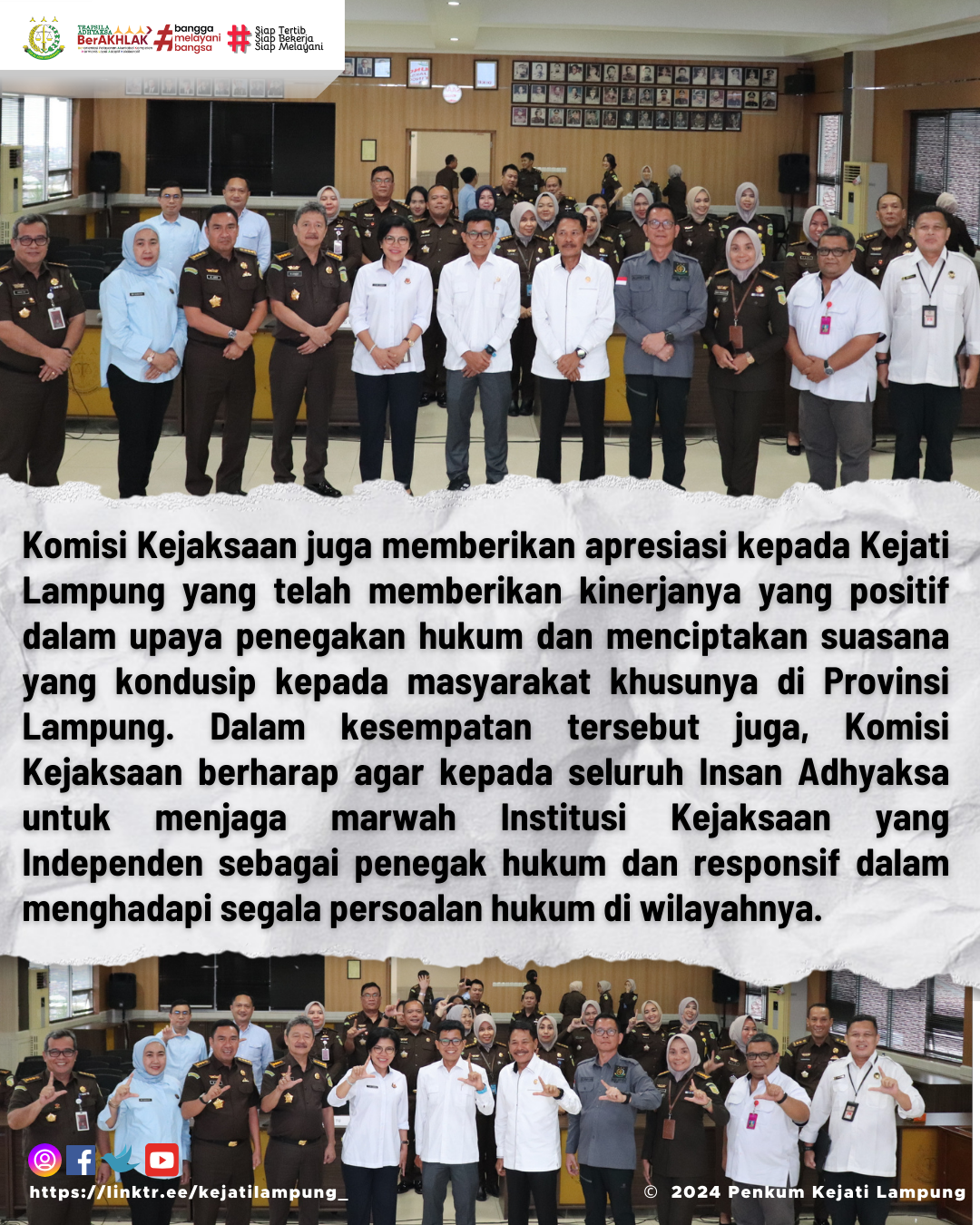 Komisi Kejaksaan juga memberikan apresiasi kepada Kejati Lampung yang telah memberikan kinerjanya yang positif dalam upaya penegakan hukum dan menciptakan suasana yang kondusip kepada masyarakat khusunya di Provinsi Lampung. Dalam kesempatan tersebut juga, Komisi Kejaksaan berharap agar kepada seluruh Insan Adhyaksa untuk menjaga marwah Institusi Kejaksaan yang Independen sebagai penegak hukum dan responsif dalam menghadapi segala persoalan hukum di wilayahnya.