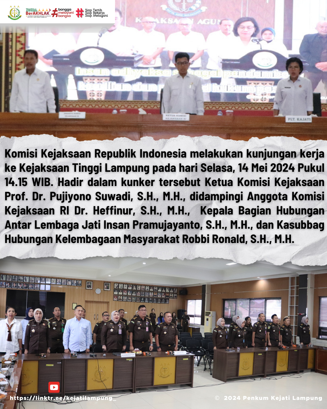 Komisi Kejaksaan Republik Indonesia melakukan kunjungan kerja ke Kejaksaan Tinggi Lampung pada hari Selasa, 14 Mei 2024 Pukul 14.15 WIB. Hadir dalam kunker tersebut Ketua Komisi Kejaksaan Prof. Dr. Pujiyono Suwadi, S.H., M.H., didampingi Anggota Komisi Kejaksaan RI Dr. Heffinur, S.H., M.H., Kepala Bagian Hubungan Antar Lembaga Jati Insan Pramujayanto, S.H., M.H., dan Kasubbag Hubungan Kelembagaan Masyarakat Robbi Ronald, S.H., M.H.