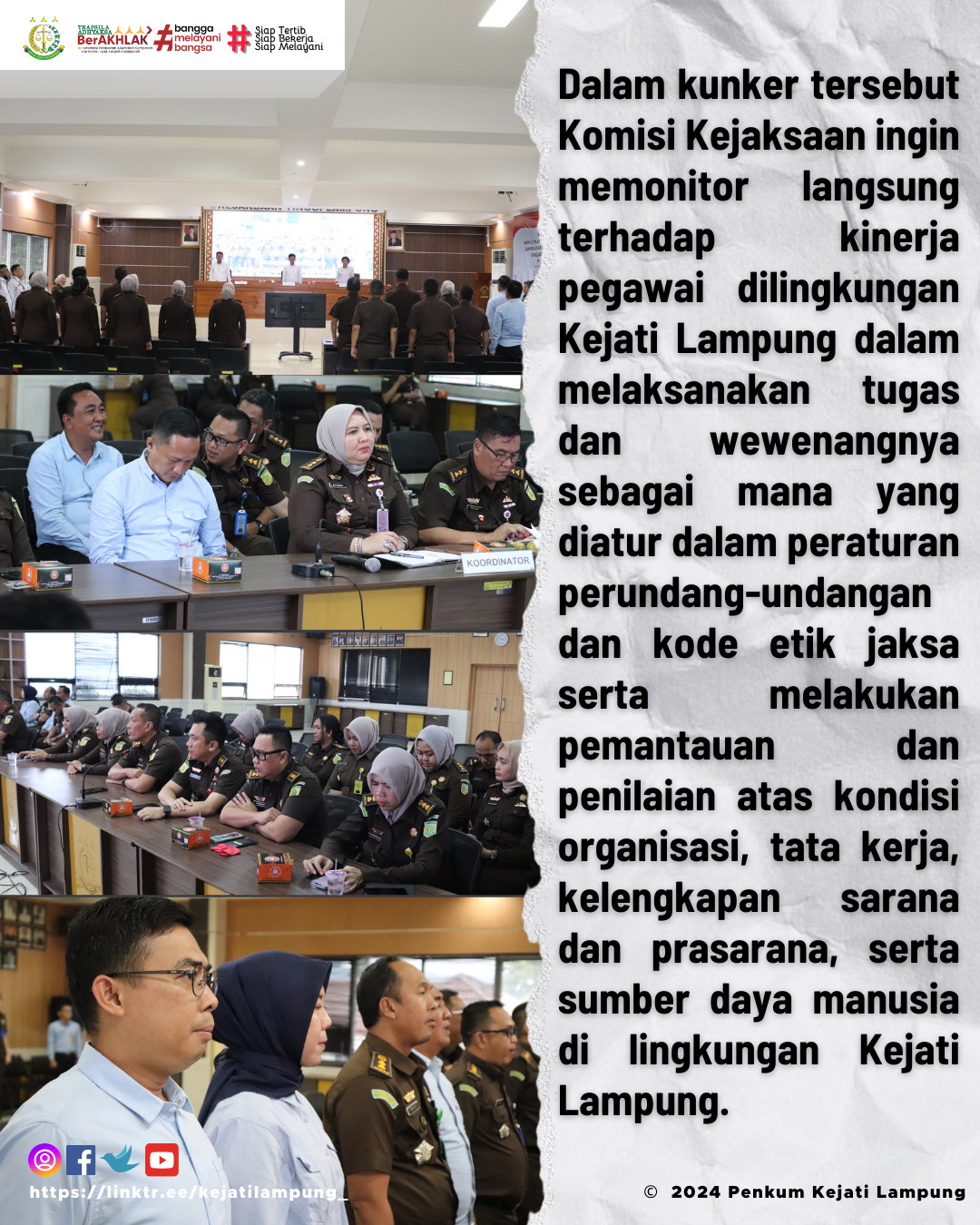 Dalam kunker tersebut Komisi Kejaksaan ingin memonitor langsung terhadap kinerja pegawai dilingkungan Kejati Lampung dalam melaksanakan tugas dan wewenangnya sebagai mana yang diatur dalam peraturan perundang-undangan dan kode etik jaksa serta melakukan pemantauan dan penilaian atas kondisi organisasi, tata kerja, kelengkapan sarana dan prasarana, serta sumber daya manusia di lingkungan Kejati Lampung.