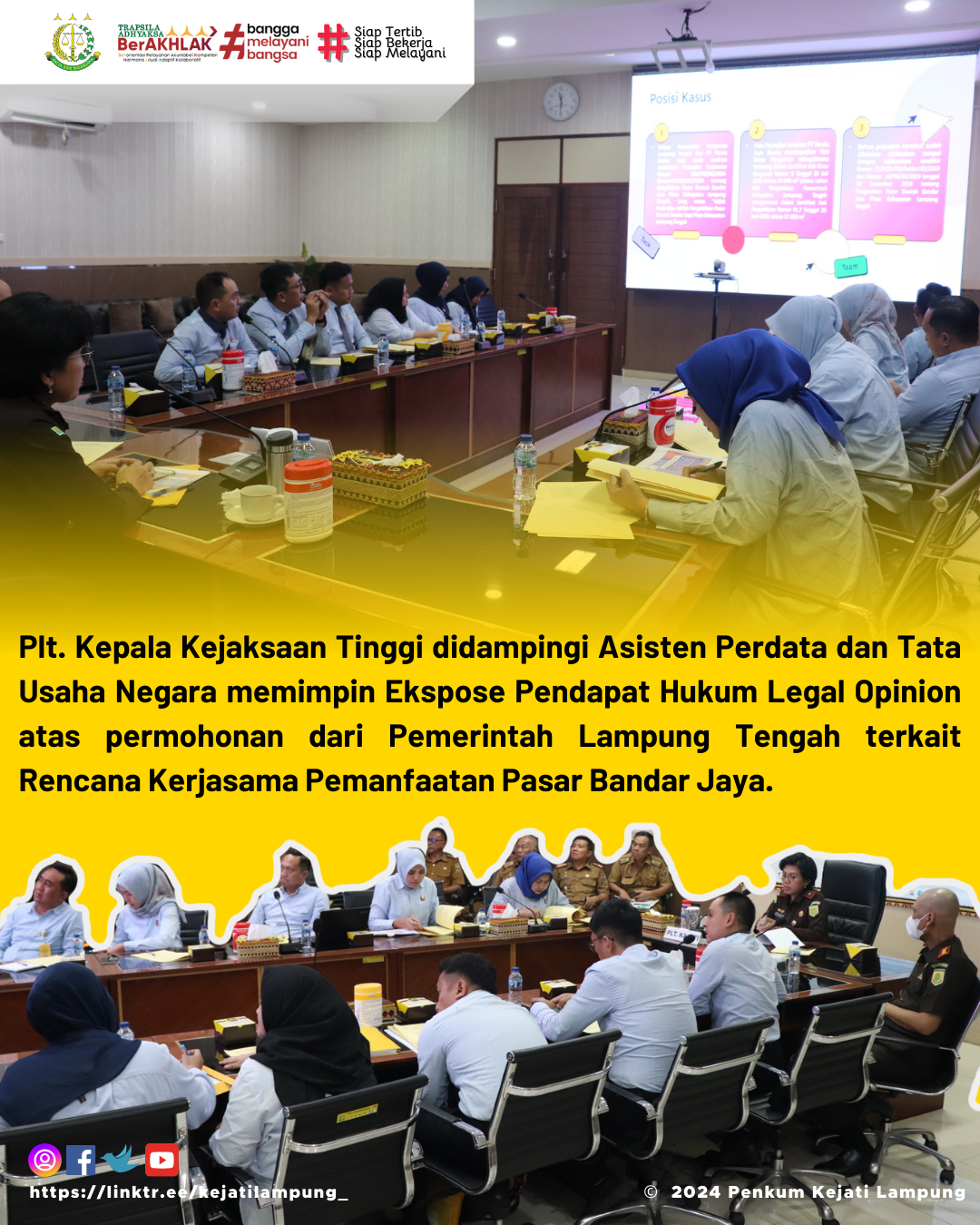 Bertempat di Ruang Vicon Kejaksaan Tinggi Lampung, 21 Mei 2024, telah dilaksanakan Ekspose Pendapat Hukum Legal Opinion dari Pemerintah Lampung Tengah atas Rencana Kerjasama Pemanfaatan Pasar Bandar Jaya.