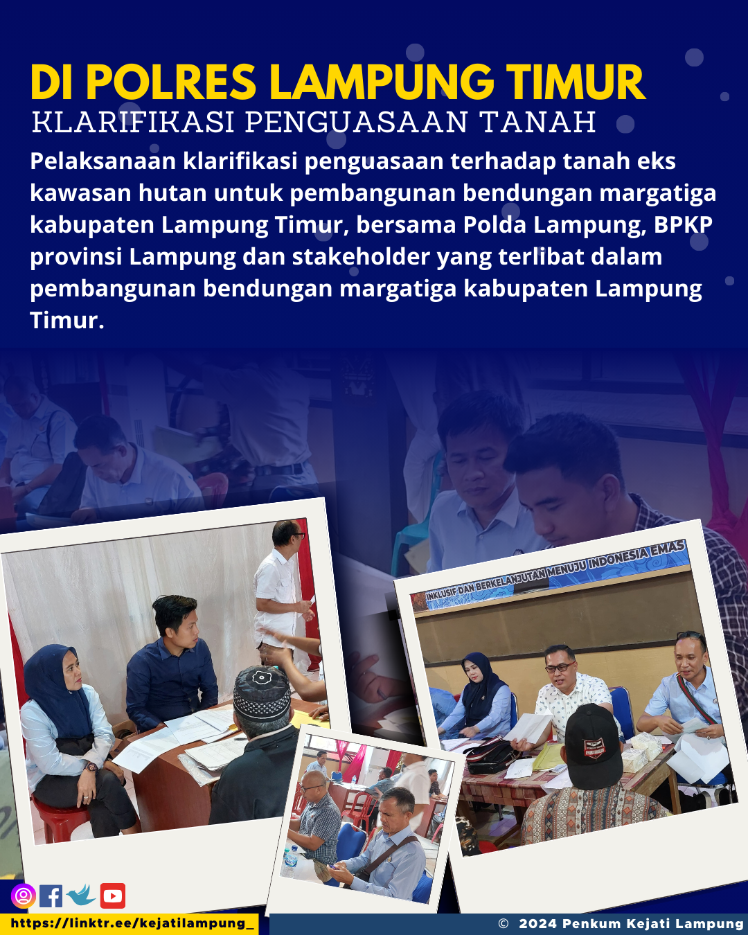 Pelaksanaan klarifikasi penguasaan terhadap tanah eks kawasan hutan untuk pembangunan bendungan margatiga kabupaten Lampung Timur, bersama Polda Lampung, BPKP provinsi Lampung dan stakeholder yang terlibat dalam pembangunan bendungan margatiga kabupaten Lampung Timur.
