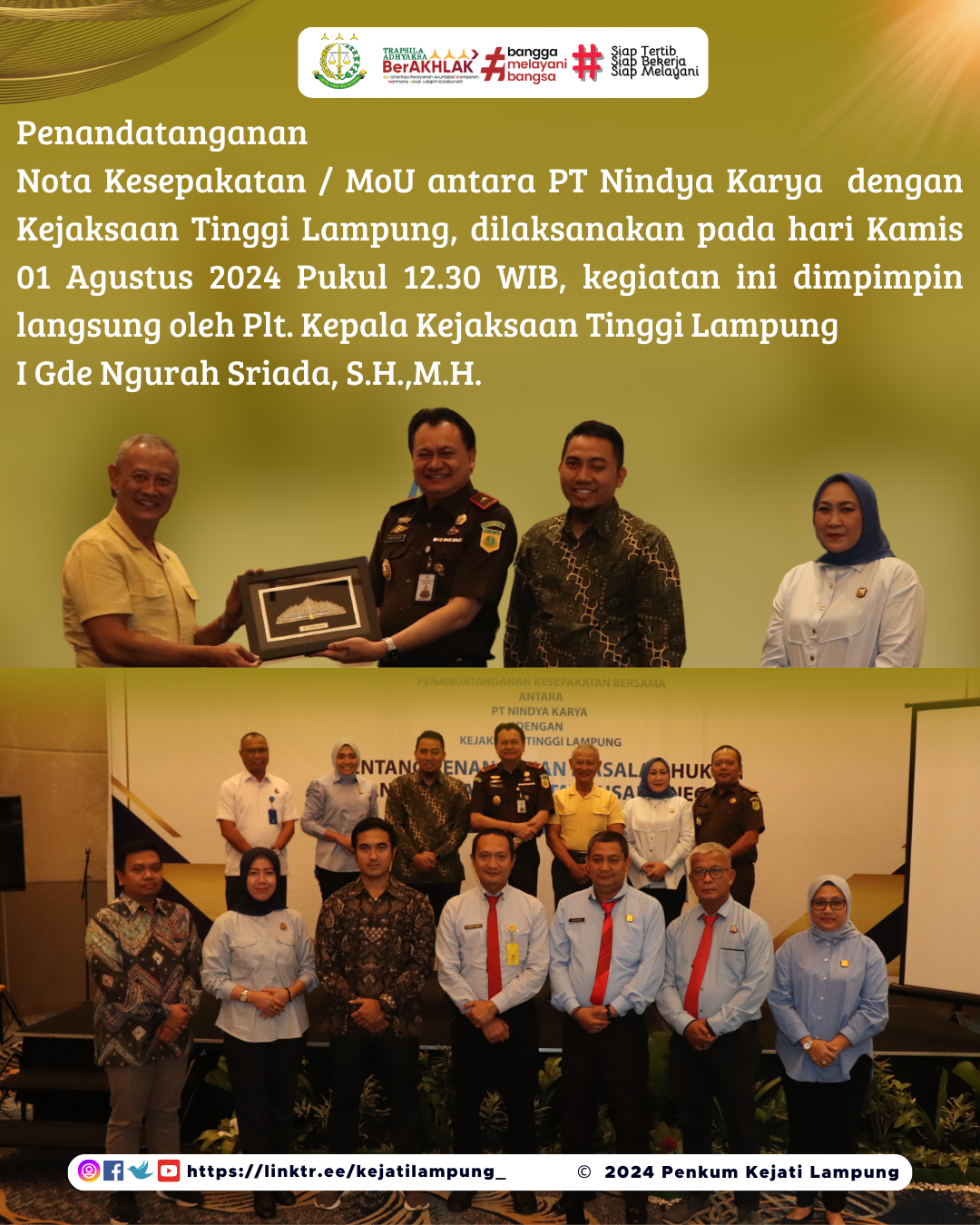 Penandatanganan Nota Kesepakatan / MoU antara PT Nindya Karya dengan Kejaksaan Tinggi Lampung, dilaksanakan pada hari Kamis 01 Agustus 2024 Pukul 12.30 WIB, kegiatan ini dimpimpin langsung oleh Plt. Kepala Kejaksaan Tinggi Lampung I Gde Ngurah Sriada, S.H.,M.H.