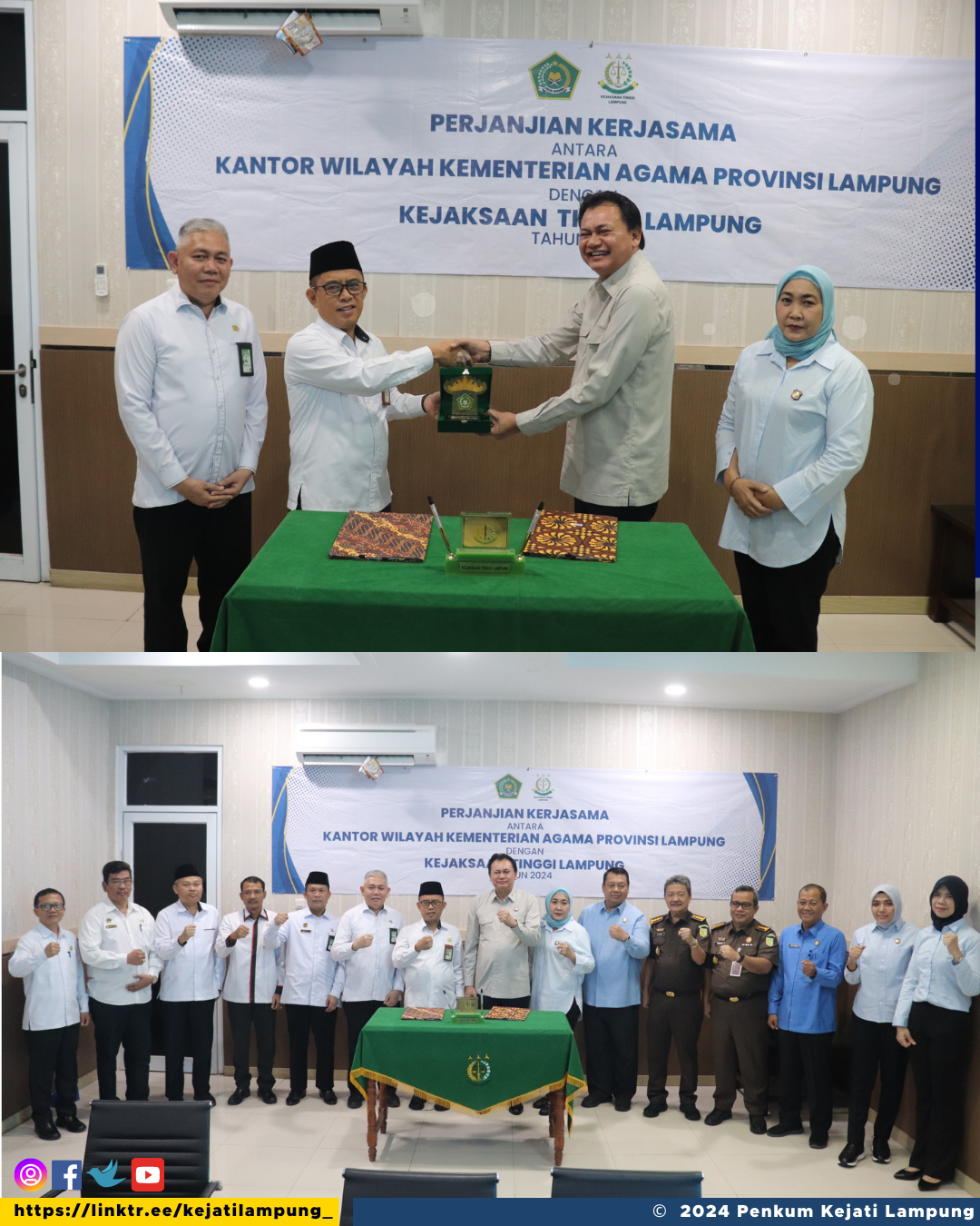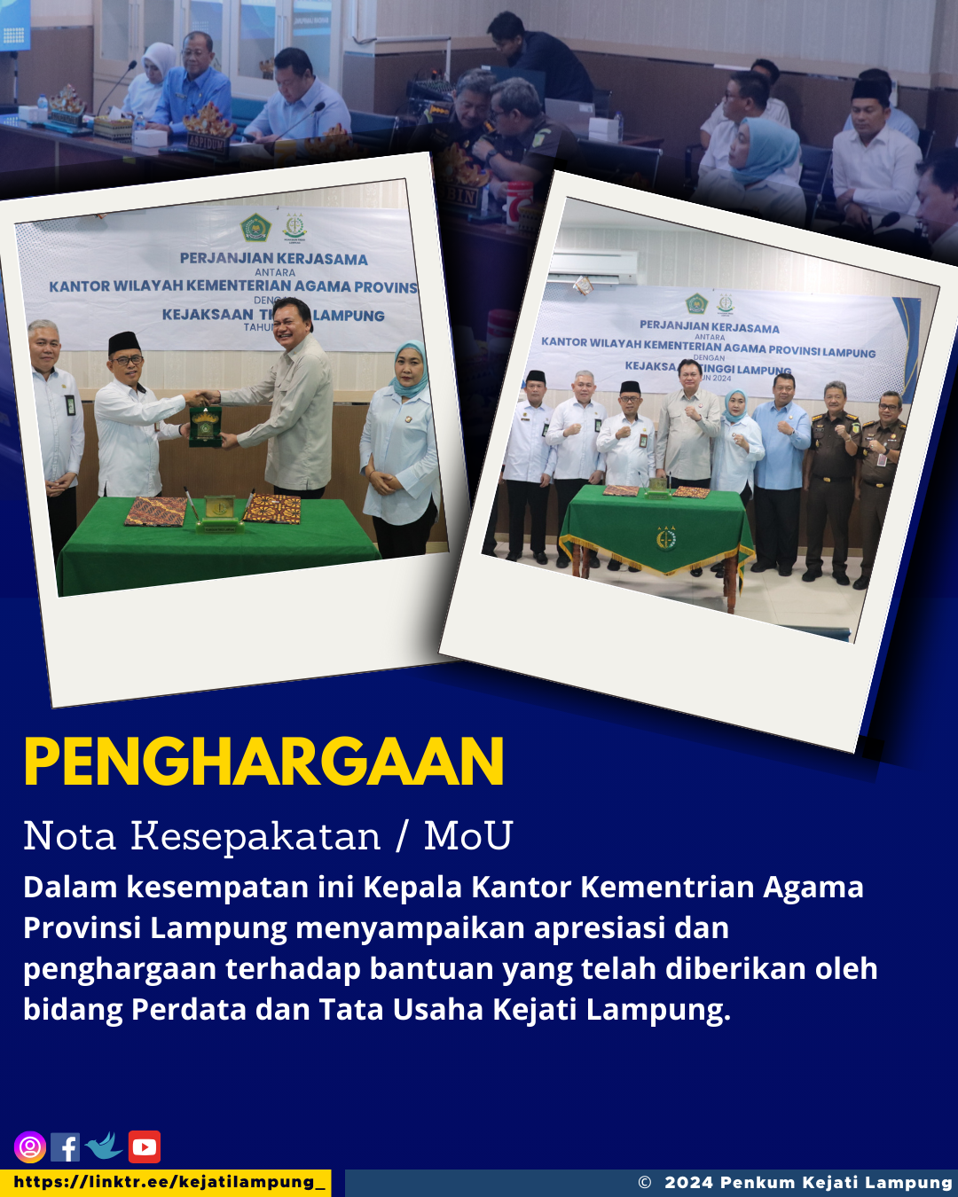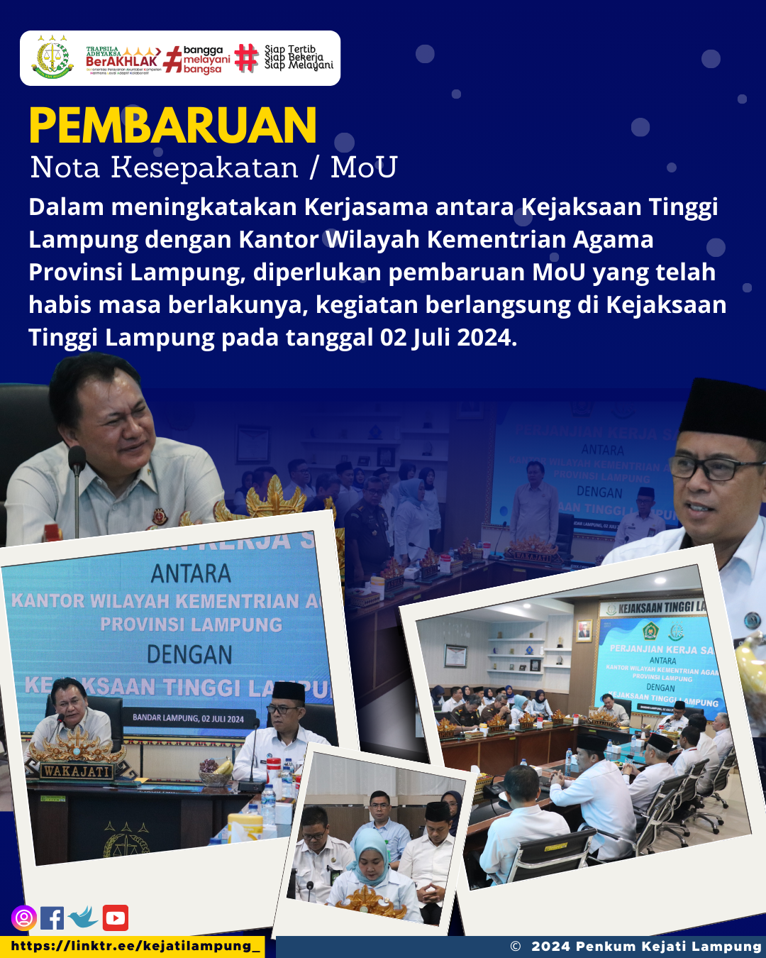 Dalam meningkatakan Kerjasama antara Kejaksaan Tinggi Lampung dengan Kantor Wilayah Kementrian Agama Provinsi Lampung, diperlukan pembaruan MoU yang telah habis masa berlakunya, kegiatan berlangsung di Kejaksaan Tinggi Lampung pada tanggal 02 Juli 2024.