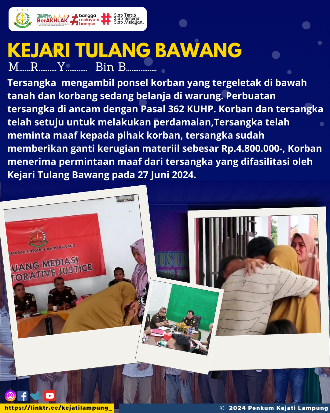 Tersangka mengambil ponsel korban yang tergeletak di bawah tanah dan korbang sedang belanja di warung. Perbuatan tersangka di ancam dengan Pasal 362 KUHP. Korban dan tersangka telah setuju untuk melakukan perdamaian,Tersangka telah meminta maaf kepada pihak korban, tersangka sudah memberikan ganti kerugian materiil sebesar Rp.4.800.000-, Korban menerima permintaan maaf dari tersangka yang difasilitasi oleh Kejari Tulang Bawang pada 27 Juni 2024.
