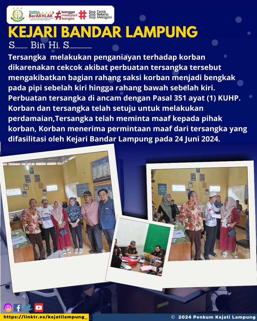 Korban dan tersangka telah setuju untuk melakukan perdamaian,Tersangka telah meminta maaf kepada pihak korban, Korban menerima permintaan maaf dari tersangka yang difasilitasi oleh Kejari Bandar Lampung pada 24 Juni 2024.