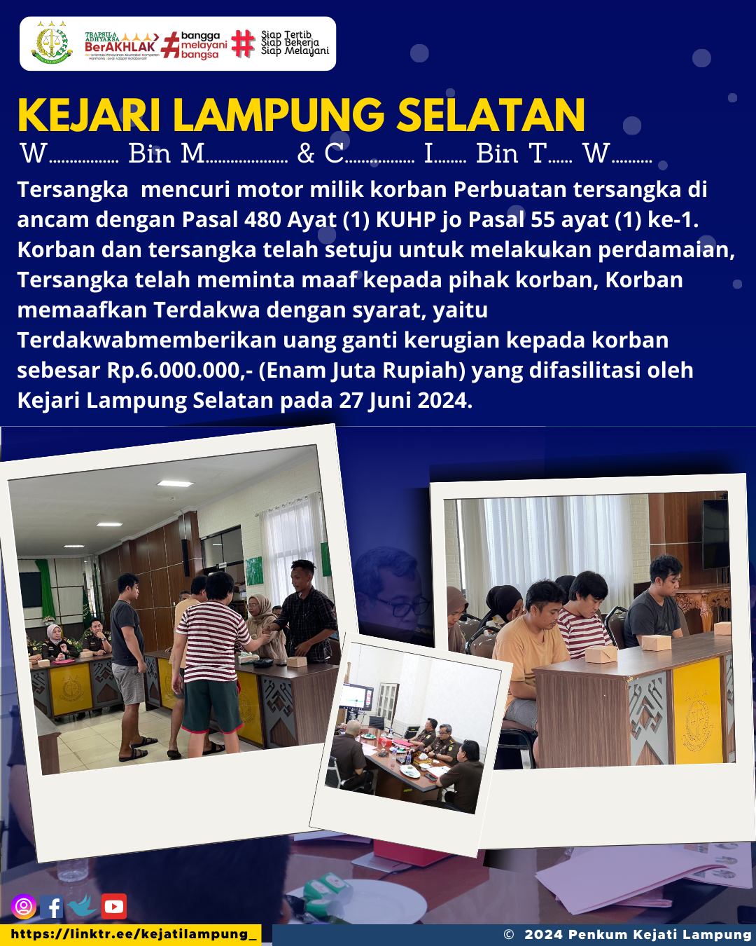 Tersangka mencuri motor milik korban Perbuatan tersangka di ancam dengan Pasal 480 Ayat (1) KUHP jo Pasal 55 ayat (1) ke-1. Korban dan tersangka telah setuju untuk melakukan perdamaian, Tersangka telah meminta maaf kepada pihak korban, Korban memaafkan Terdakwa dengan syarat, yaitu Terdakwabmemberikan uang ganti kerugian kepada korban sebesar Rp.6.000.000,- (Enam Juta Rupiah) yang difasilitasi oleh Kejari Lampung Selatan pada 27 Juni 2024.