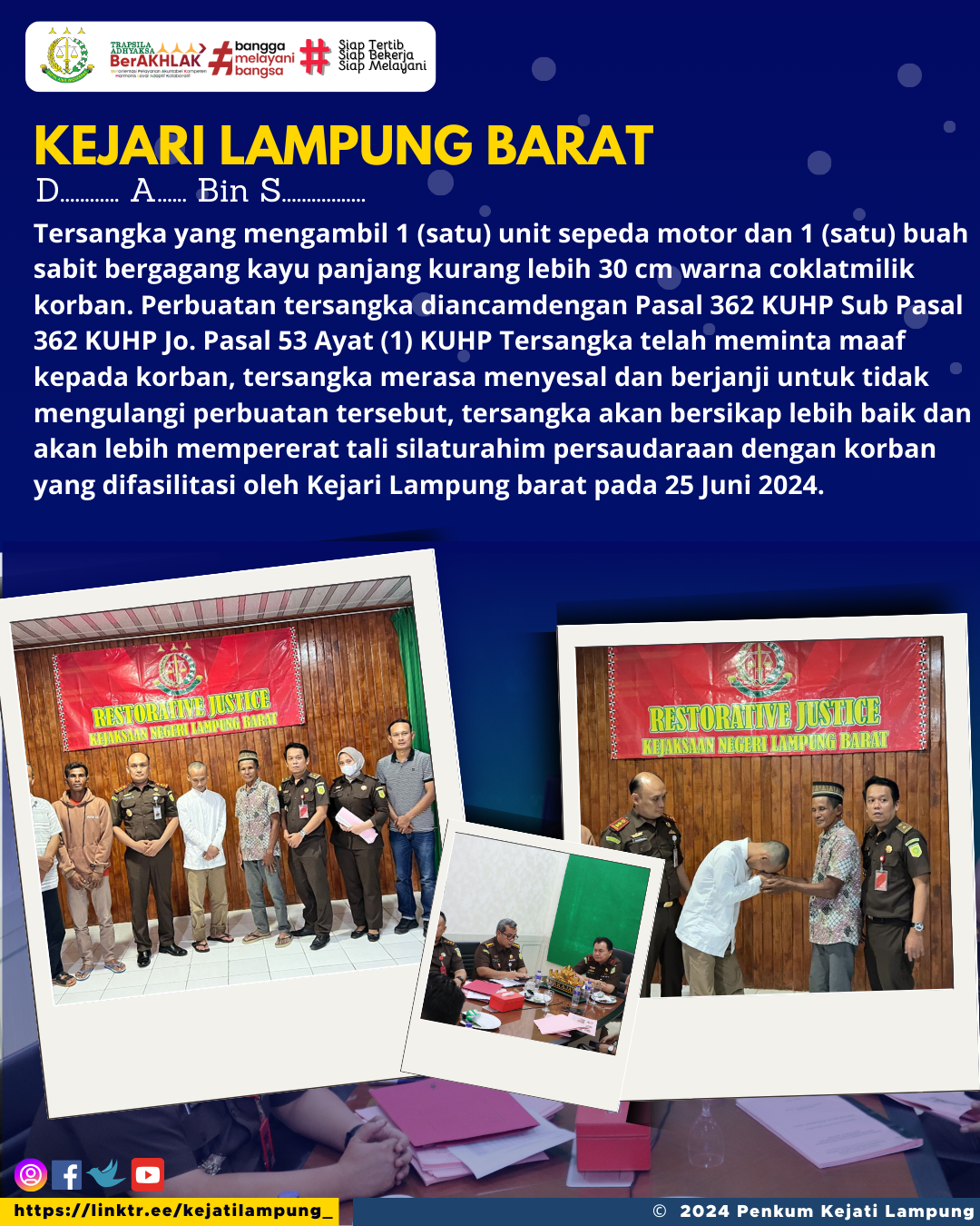 Tersangka yang mengambil 1 (satu) unit sepeda motor dan 1 (satu) buah sabit bergagang kayu panjang kurang lebih 30 cm warna coklatmilik korban. Perbuatan tersangka diancamdengan Pasal 362 KUHP Sub Pasal 362 KUHP Jo. Pasal 53 Ayat (1) KUHP Tersangka telah meminta maaf kepada korban, tersangka merasa menyesal dan berjanji untuk tidak mengulangi perbuatan tersebut, tersangka akan bersikap lebih baik dan akan lebih mempererat tali silaturahim persaudaraan dengan korban yang difasilitasi oleh Kejari Lampung barat pada 25 Juni 2024.