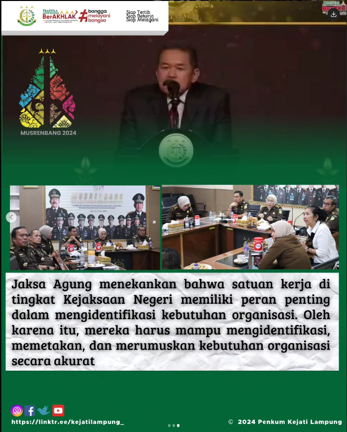 Jaksa Agung menekankan bahwa satuan kerja di tingkat Kejaksaan Negeri memiliki peran penting dalam mengidentifikasi kebutuhan organisasi. Oleh karena itu, mereka harus mampu mengidentifikasi, memetakan, dan merumuskan kebutuhan organisasi secara akurat.