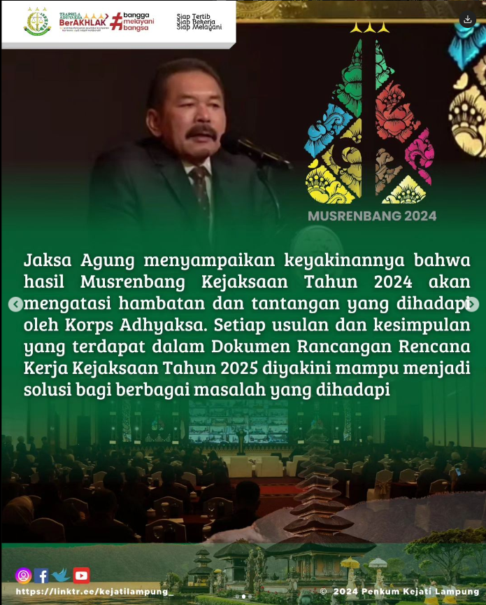Jaksa Agung menyampaikan keyakinannya bahwa hasil Musrenbang Kejaksaan Tahun 2024 akan mengatasi hambatan dan tantangan yang dihadapi oleh Korps Adhyaksa. Setiap usulan dan kesimpulan yang terdapat dalam Dokumen Rancangan Rencana Kerja Kejaksaan Tahun 2025 diyakini mampu menjadi solusi bagi berbagai masalah yang dihadapi.