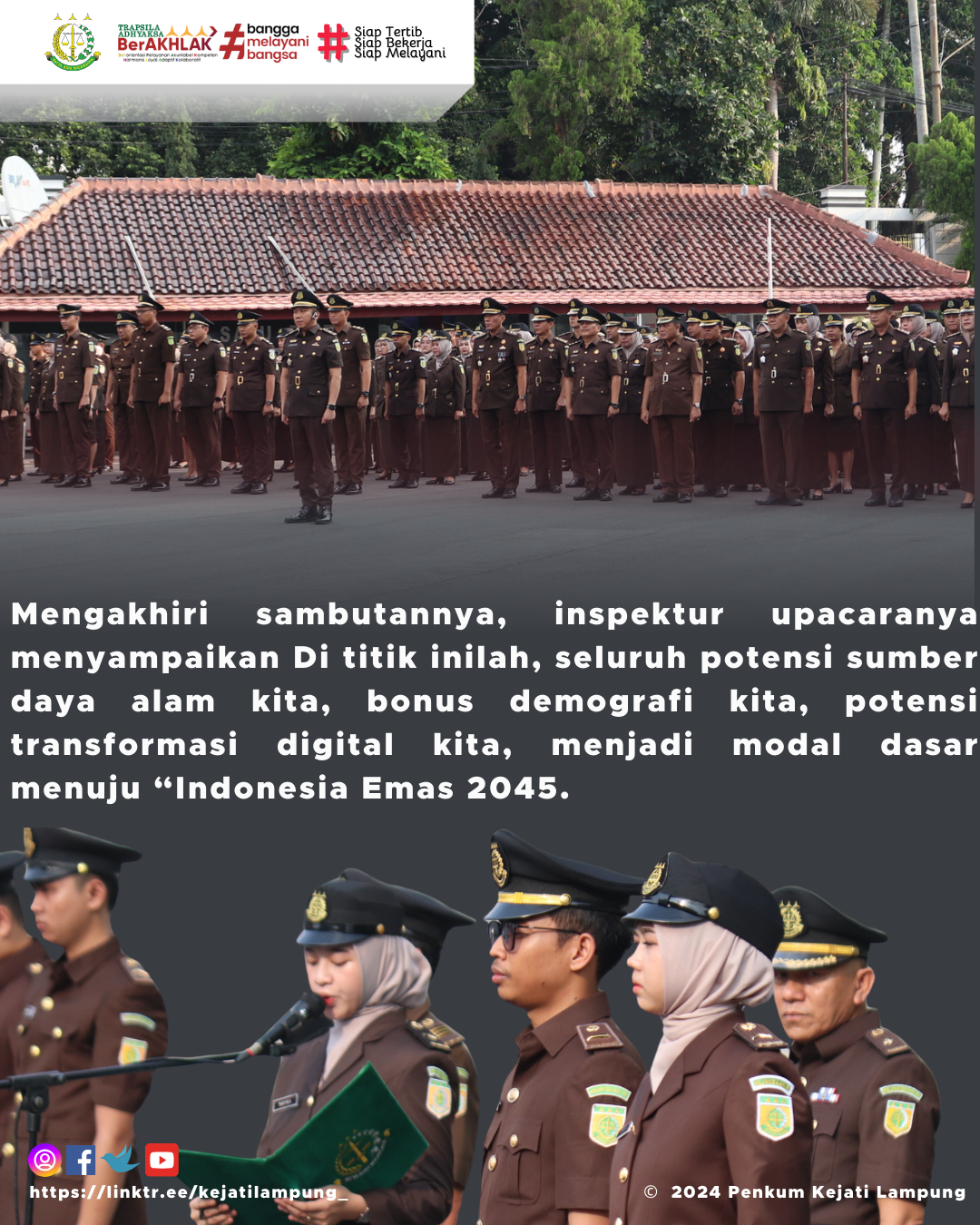 Mengakhiri sambutannya, inspektur upacaranya menyampaikan Di titik inilah, seluruh potensi sumber daya alam kita, bonus demografi kita, potensi transformasi digital kita, menjadi modal dasar menuju “Indonesia Emas 2045.