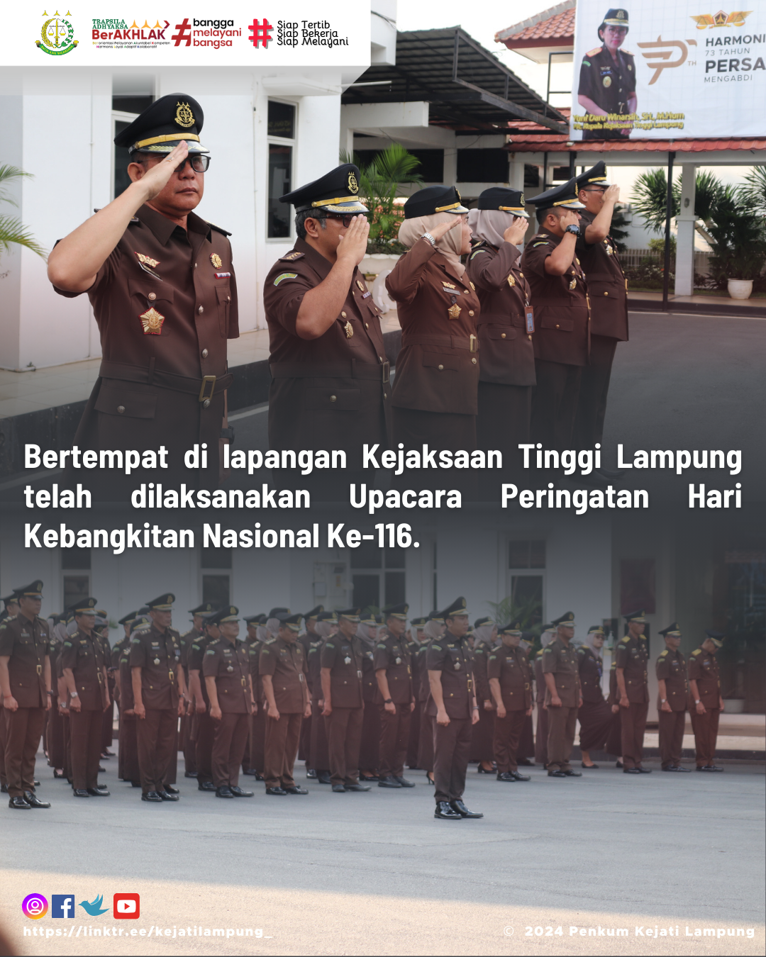 Bertempat di lapangan Kejaksaan Tinggi Lampung telah dilaksanakan Upacara Peringatan Hari Kebangkitan Nasional Ke-116.